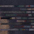 The soft board of the full pigskin binding is made up of two layers of leather, which is dyed grey. The middle of the front and back board is decorated with nine horizontal strings of varying lengths, composed of pigskin strips of a variety of colours and lengths, glued to the boards and connected with stitches of threads in different colours. A thin wooden stick runs along the inside of the front edge of each board, touching the text block, sewn to the board with colour thread. The entire surface of the spine bears blind-stamped vertical lines, which extend to the boards as well. The book comes with a protective cover with a whole leather binding and grey suede lining, with the inscription ‘Parisiens’ printed in silver on the spine.