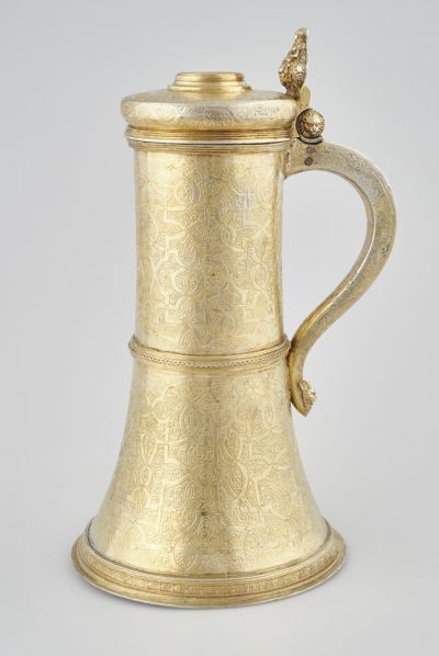 This masterpiece with etched designs, known in the literature as the "arabesque tankard", was most certainly created under such inspiration. The entire surface is covered in arabesque, ribbon ornamentation. The decoration is based on the compositions found in mid-16th century southern German pattern sheets. Hannelore Muller in her work European Silver. The Thyssen- Bornemisza Collection (London, 1986) published a similar piece (cat. no. 81).