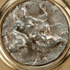 Circular, fluted foot. It is embossed overall with figures separately cast and soldered later: bathing naiads, women, putti and dolphins. On the middle of the cover is a statue of a woman with fishes and a jug. It has a beaded scroll handle, with a voluted forking thumbpiece. Marks on the foot and the cover: Vienna, 1806—1807.