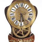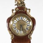 The plain, prismatic plinth holds the splayed bottom part of lozenge decoration. The case of the pendulum fits into the curved top of the bottom part. Its narrowing body is also decorated with lozenges. The door of the case is framed by a bronze framework. Above the door, ensigning the framework, a bronze ornament appears composed of a globe, compasses, a square ruler, a pencil and a roll of paper. The case of the clock shapes a cartouche behind the glass door the engraved copper plate shows Roman numerals over enamel inlays. There is a bronze crest of flower motifs on the top of the clock. Exceptionally beautiful Ch. Cressent long-case clocks, in structure and decoration similar to the piece described above can be found in the Museum of Metz. Copies of the exhibited clock are in Windsor Castle and in the Österreichisches Museum für Angewandte Kunst in Vienna.