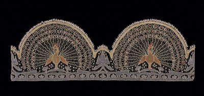 The bottom edge of the lace is straight, the top, following the line of the tail feathers, is semicircular. The peacocks are pictured facing, divided by a stylized tulip motif. The peacock motif is replaced by small hearts. The main motif is enriched with moderately applied lace stitches and strong contours.