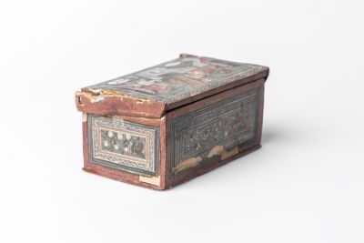 Shape of a horizontal prism. The sides are decorated with multi-framed panels, showing a running dog motif and a garland of red and white flowers and a bird. The top is decorated with a painted scene: Judith stands in front of a castle wall, among trees and bushes, holding the head of Holofernes in her left hand and her sword in her right. The scene is surmounted by an inscription "Judith" in an oval field, and by the date 1558.