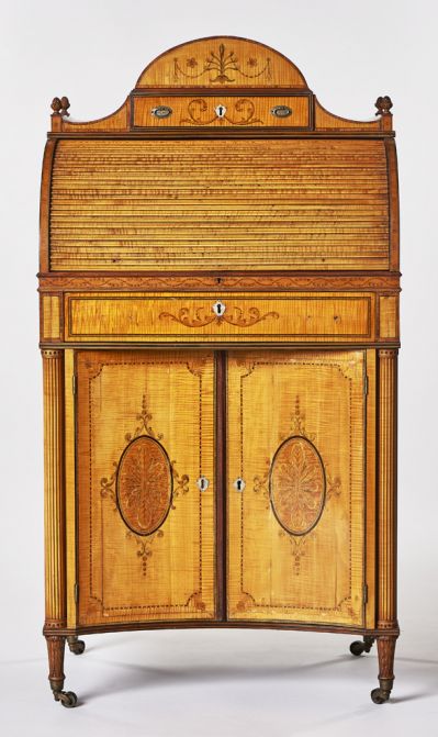 The urban building work that gathered momentum in England in the late 18th century offered spaces for smaller-sized, multifunctional furniture satisfying middle-class needs. The light, variously fashioned, smaller-sized, richly decorated, neoclassical furniture of the period 1790–1800 is named after the cabinetmaker Thomas Sheraton, who wrote himself into the history of European furniture art primarily through his work as a designer, sketcher and writer on furniture. In his books of designs, he summed up the taste of the age. A book of designs by the artist-cabinetmaker and upholsterer appeared between 1791 and 1794 entitled The Cabinet Maker and Upholsterers Drawing Book, in which he discussed questions of perspective, geometry, architecture, and drawing. This work ran to three editions. Written in an outstandingly good style, Sheraton’s books had a formative effect on those around him and circulated widely. Sheraton intended his books for producers on the one hand and for customers on the other. In England, six hundred craftsmen and dealers subscribed to his design collections. In these design books, small pieces of furniture were presented that were of sophisticated construction, varying in form, light, practical, and user-friendly. A fine example of those built is the lady’s writing desk shown here. Practical because it could be easily moved on casters towards the light and comfortable because the concave recess formed by its two lower doors made sitting at it easier when its surface is pulled out, the inner part of its superstructure part is uncovered. This can be closed with a single movement, by pulling down the roller-blind.