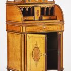 The urban building work that gathered momentum in England in the late 18th century offered spaces for smaller-sized, multifunctional furniture satisfying middle-class needs. The light, variously fashioned, smaller-sized, richly decorated, neoclassical furniture of the period 1790–1800 is named after the cabinetmaker Thomas Sheraton, who wrote himself into the history of European furniture art primarily through his work as a designer, sketcher and writer on furniture. In his books of designs, he summed up the taste of the age. A book of designs by the artist-cabinetmaker and upholsterer appeared between 1791 and 1794 entitled The Cabinet Maker and Upholsterers Drawing Book, in which he discussed questions of perspective, geometry, architecture, and drawing. This work ran to three editions. Written in an outstandingly good style, Sheraton’s books had a formative effect on those around him and circulated widely. Sheraton intended his books for producers on the one hand and for customers on the other. In England, six hundred craftsmen and dealers subscribed to his design collections. In these design books, small pieces of furniture were presented that were of sophisticated construction, varying in form, light, practical, and user-friendly. A fine example of those built is the lady’s writing desk shown here. Practical because it could be easily moved on casters towards the light and comfortable because the concave recess formed by its two lower doors made sitting at it easier when its surface is pulled out, the inner part of its superstructure part is uncovered. This can be closed with a single movement, by pulling down the roller-blind.
