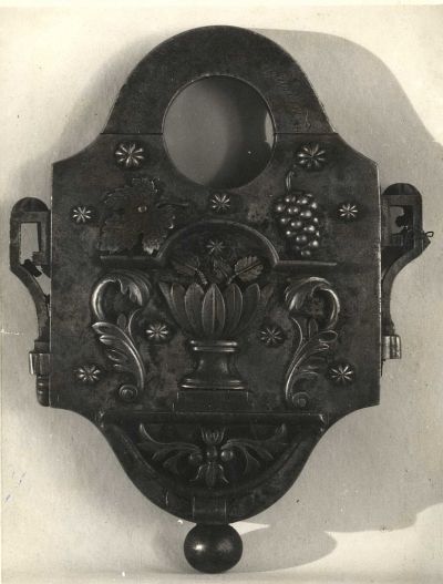 The padlock is curved at the top and bottom but straight on the two sides at the bottom, there is a twistable ball, surmounted by a hinged, semicircular keyhole shield with repousse leaves and tulips. The middle part is decorated with a repousse vase of spear leaves and a rosette. The sides are enriched with a tendril, rosettes and leaves. Above them, there is a broken, semicircular corniche with leaves and clusters of grapes. The padlock is topped with a circular slot with a hook, signed with an inscription in cursives. The narrower sides are equipped with rectangular volutes with shell motifs. At the back, there is a dial of a clock, with Roman numerals and brass arms, enclosed by twelve small rosettes.