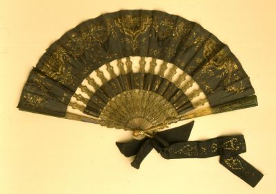 The blue leaf of this so-called cabriolet fan is embellished with alternating pointed and arched festoons. The motifs are enriched by the variety of the spangle shapes and the diversity of their finish. On the light-coloured, horn-like sticks are acanthus leaves set round with scallops and small steel rivets (so-called pique). On the bottom of the handle is a small ring, to which a ribbon, made from the same material as the leaf and adorned with spangles, is attached.