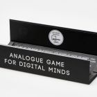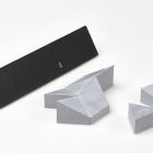 The pieces of the game are simple, truncated triangular prisms, which players must place next to each other to form a surface without steps. The first piece has the manufacturer’s name, Planbureau impressed on it. The pieces are packaged in a tight row. The packaging is a piece of black cardboard folded into four and embossed with a triangular grid pattern, which, when folded into a triangular prism, presses close onto the concrete pieces it holds.