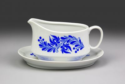 Sauce jug with saucer (part of a set) - Part of the Krisztina-202 tableware set with blue Hungarian style pattern