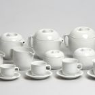 The awarded items of the Varia competition were exhibited as part of the Művész az iparban (Artist in Industry) exhibition series launched by the Applied Arts Council in the Museum of Applied Arts between December 15, 1972 and January 15, 1973. In the meantime, László Horváth won another award with the Saturnus set at the 3rd National Ceramics Biennial in Pécs, where the service came in second. In 1972, a few items of the Saturnus set were also displayed at the exhibition titled Magyar design (10 kísérlet) (Hungarian Design [10 experiments]) held in Fészek Artists’ Club, organized by Sándor Borz Kováts, Mihály Pohárnok and György Soltész. The experimental exhibition showcasing ten works of eight designers started a meaning conversation in the paper titled Művészet (Art) about the questions of design.