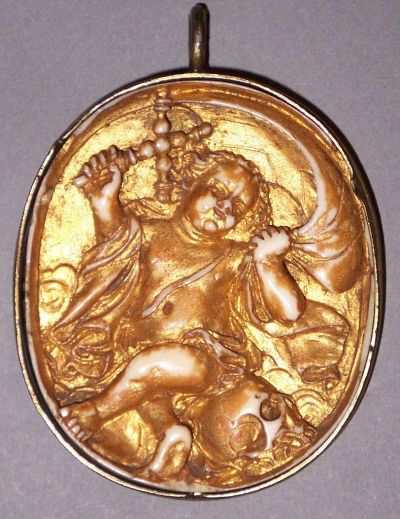 On one side of the medallion are St. Bernard and the infant Jesus with the instruments of the Passion: the infant Jesus is sleeping on the cross, by his hands are nails and the crown of thorns. Behind him is St. Bernard, clasping the lance and sponge to his heart, pointing to the sky with his right hand. On the other side of the medallion is the infant Jesus victorious over death: he is sitting on a skull, has a cross in his right hand and lifts a waving drapery over his head with his left hand. Zoltan Szilardfy indentified the medallion as the pendant of the rosary of a Cistercian abbot or abbess on the basis of its special iconography and quality.