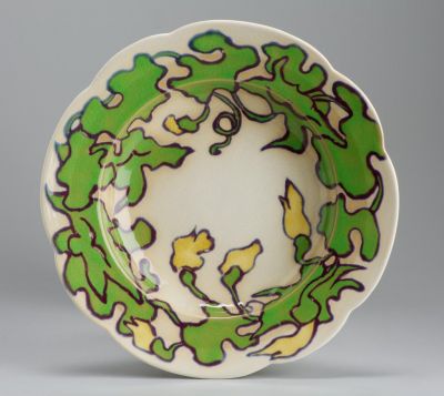 The deep soup plate has a splaying, slanted, eight- lobed rim. It is decorated with a stylized tendril, reaching back into the centre with loose, green leaves and yellow buds. The unshaded colour patches are outlined by sensitive, thick blue brush contours. The bowl and the edge of the rim are coloured with white. In the centre of the foliage and at the end of the stem the natural yellowish colour of the clay material appears. This form was numbered 2527 in the Zsolnay factory Fafon book (Suppenteller), then it became part of the Neo-baroque dish set No. 2655. According to the notebook of Teréz Zsolnay (JPM Ad. Inv.No. 1578-91-1584), it was designed in 1889. The drawing of the plate cannot be found in the chronologically arranged Décor Book between 1897 and 1900, only later, in the 7th book from 1907- 1908, under number 5134, with ’’Rippl-Rónai” notation. The alternative picture of this décor can be seen on a companion piece in the- Janus Pannonius Museum of Pécs (Inv.No. 51.5059.1).