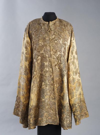 Straight cut, flaring at the hip. It has upright collar and the sleeves are longer than the arm, reaching to the bottom of the dress. The textile used to be flesh-coloured, but is now yellowish silk cloth, with a bizarre pattern of shells, volutes, motifs of clouds and a horn of plenty. The sleeve of a woman's dress found in a grave at Gyulafehervar was made of similar material. The front, the neck, the bottom and the sides — on the front up to the waist, on the back on a shorter part — are framed with a "guipure" made of silver and gold thread, without ground net. Similar Spanish laces can be found — among others — in a Lyon collection. Under the collar is a button band woven from gilt thread and there are seven woven loops. From the segmented trimming buttons sewed with gold thread only one has remained. The lining is yellow silk with a miniature pattern: bending volutes, scattered palmettes brocaded with metal wire. A similar textile fragment from the 17th century is in the collection of the National Museum of Cracow. The description of the 1725 inventory of the Frakno treasury of the Esterhazy family runs: —"A summer mente made of flesh-coloured flowered brocade, with gold lace, and seven gold buttons". (Inventarium Thesauri Fraknensis Anno 1725. Almarium Sub. Nris. 79 et 80. Nro. 6. — Inventory of Museum of Applied Arts 236 / 1957. ).