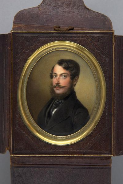 The portrait shows a young man with a moustache and a beard he wears a black coat, waistcoat and tie. The person was identified with Count Moric Almassy or Janos Lonyai in earlier literature. On the basis of authentic portraits, the latter can be excluded yet the identification can still not be definitively proved, despite the great similarity. The folding leather case of the miniature is decorated with stamped, historical motifs.
