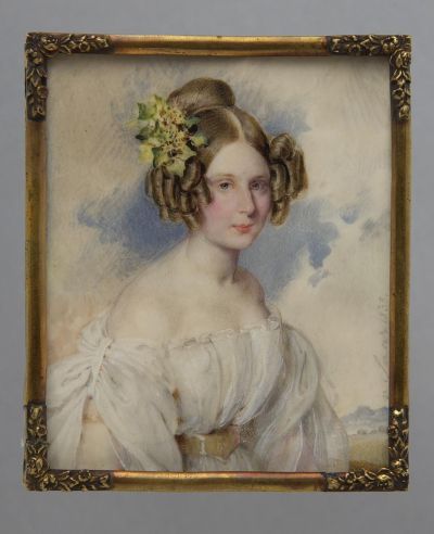 The half portrait of an unknown young woman, wearing a white dress and a golden belt with a leaved bunch of flowers in her hair.