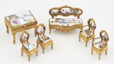 The set consists of a piano, a settee, a screen, a table, two armchairs and two chairs. The front and back of each piece is painted in enamel, with Rococo scenes, showing lovers, musicians in an idyllic, landscape surroundings. This is a less elaborate, nineteenth century version of fashionable vitrine objects that were wide-spread from the 18th century onwards.