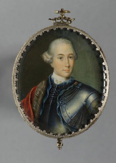 The oval picture shows a young man with powdered hair, dressed in armour, in front of a greyish- green background. The plain smile and the expressionless look on his face are probably due to the affected style of the painter instead of being personal characteristics of the model. Marked on the right: A. F. König.