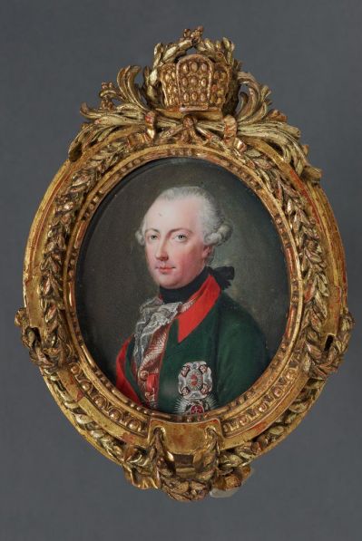 The portrait shows Joseph II in a green uniform with red collar, which is the uniform of the imperial light cavalry. He is wearing the Order of the Golden Fleece, the Star of the Grand Cross of Mary Theresa's Army, Order and the Ribbon and Star of the Grand Cross of the Royal Hungarian Szent István Knightly. The carved string of pearl and leaf decoration of the frame is closed by the Holy Roman imperial crown.