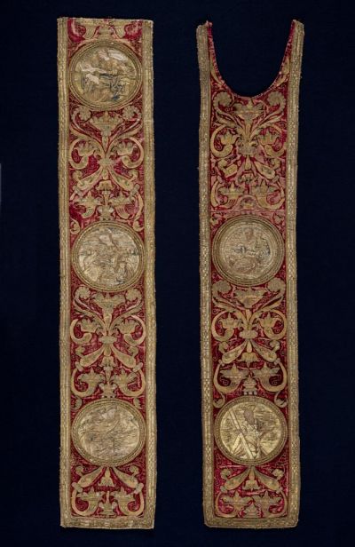 Fragments of an orphrey with identical decoration, although portraying different saints are to be found in the Castiglioni collection in Vienna (Italy, 16th century).
