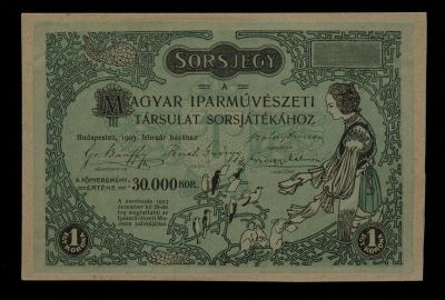 This artistic lottery was designed in the style of the Gödöllő artist circle, especially the illustrations of Sándor Nagy and his wife, Laura Kriesch. The main field is bordered by delicate, bent lines. The text appears in the field, similar to paper banknotes. There is a female figure on the right, dressed in Hungarian clothing, giving lottery tickets to small animal figures. The most interesting feature of the ticket is that it bears the signatures of significant leaders of the Hungarian Society for Applied Arts: György Ráth, the chairman, Imre Szálai, vice-president, Kálmán Györgyi, the secretary, and Count Imre Bánffy, board member. The main prize was a diningroom textile set, designed by Pál Horti.