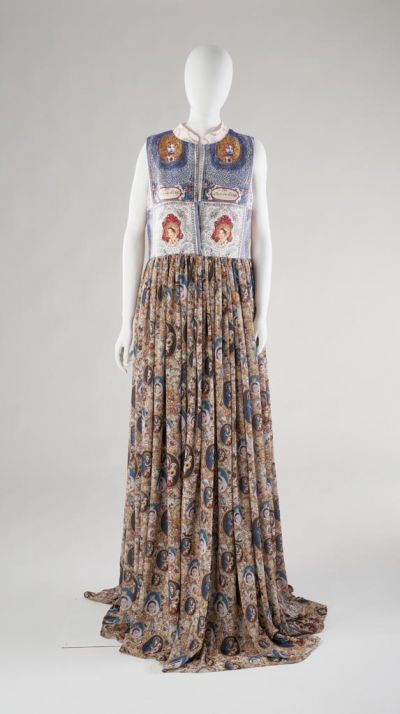 The "Women’s Emancipation" dress was created as part of the exhibition series In Circulation, launched by the Contemporary Design Department in 2018. According to the concept, the invited designer will select an object or ensemble of objects from the collection of the Museum of Applied Arts, and will create a new design as inspired by the object(s). Our fifth invited artist in the series is Romani Design founded by Erika Varga and Helena Varga in 2010. The sisters chose a total of six art objects from the collections of the museum. It is not by chance that these are all devotional pictures depicting either the Virgin Mary or other female saints, which provided the inspiration for the designers to create six enchantingly richly patterned women’s garments and coordinated accessories (see also 2021.515.1.