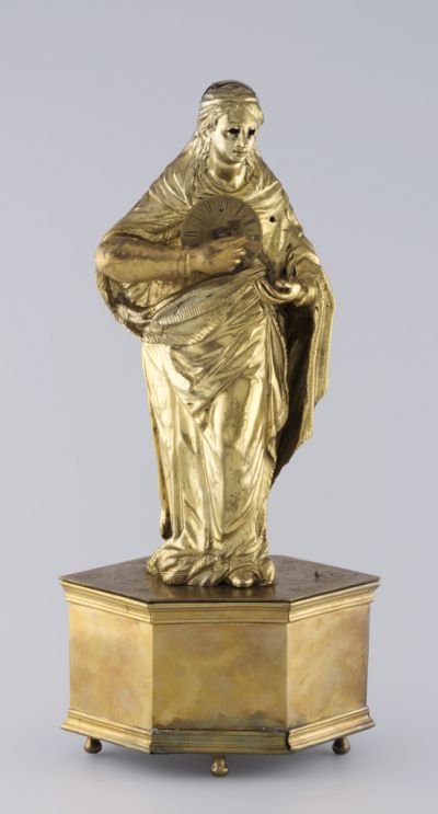 The cast statue of St. Maty Magdalene wearing a pleated cloack stands on a hexagonal prism base with four bun feet, containing the mechanism. The face of the clock has on hand applied on the chest of the figure, the other hand is missing. The right hand is made of gilt, carved wood and originally it was moved by the mechanism with the help of an inner transmission. The attribute, originally held in the figure's left hand — and presumably a skull — is missing.