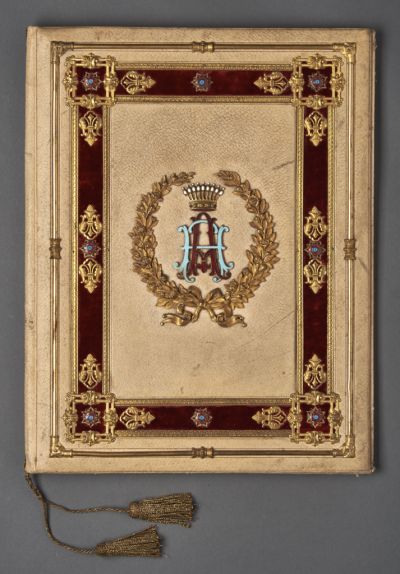 Materials: | leather cover; metal studs; moire silk; paper; silk ribbon; velvet |