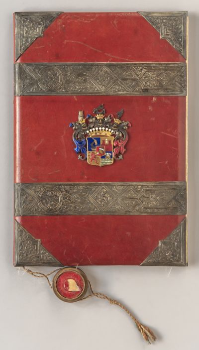 Materials: | goatskin; metal studs; parchment; silk; wooden board |