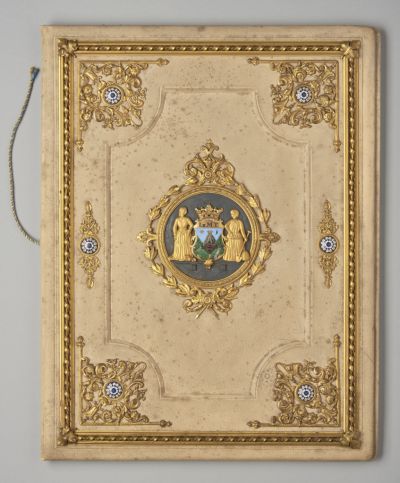 Materials: | goatskin; metal studs; parchment; repp silk (ribbed silk fabric); silk cord |