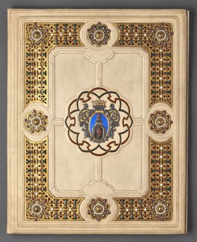 Techniques: embedded polychrome enamel; gilded; leather binding