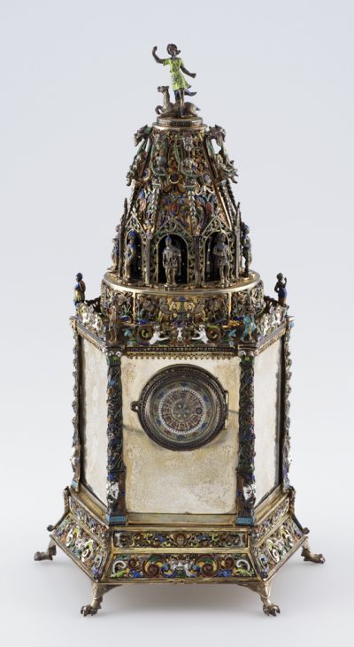 A mechanism of a pocket watch, made by the Le Roy watchmaker dynasty in Paris at the turn of the 18th-19th century and equipped later with an enamel dial is built in the case. The shape of the case was modelled on Renaissance tower-shaped clocks. It is prismatic, with six sides, supported by six small claw feet the plinth is emphasized by enamelled masked and tendrils. The sides are plain only the edges show a decoration similar to that of the plinth, with tendrils springing from a bearded, grotesque mask. The prism is topped with a conical roof with enamelled decoration enriched with cupids and masks in the front, rising up from the edge of the prism. The corners are marked with an allegorical female figure. The top is curved, presenting eight Roman warrior figures in compartments with starry blue background. The top part of the roof is pierced, enriched with almandine and painted in enamel, closed by eight garlands ending in a grotesque heads, held up by cupids. There is an allegorical female figure with a camel (?) on the top of the roof. The decoration was influenced by the most various sources, made exclusively for decoration, ignoring any symbolic meaning.