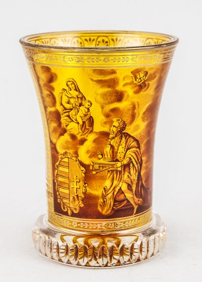 The splayed glass stands on a broad foot with cogwheel faceting, a typical example of the Ranftbecher type of Kothgasser's glasses. There are stained and faceted star motifs in the middle of the foot, while the surface of the glass is decorated with similar technique and reddish-brown, transparent enamel painting: St. Stephen, King of Hungary, equipped with the coronation emblems, offers up Hungary to the protection of the Virgin Mary. The scene is framed with silver varnish and gilt, stylised, flowery boughs, there is an inscription in gold cursives below: Minden á Nemzetert.