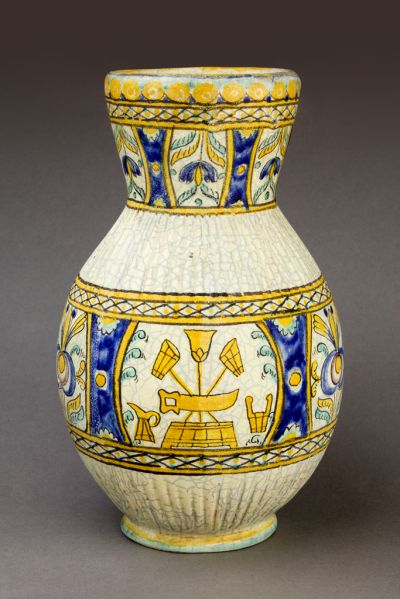 Techniques: | cracked/craquele glaze; hand-shaped; painted with polychrome glazes |