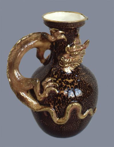 The elongated ball-shaped body ends in a slim neck and a splaying top rim with a spout. The dragon figure, which shapes the handle, is almost standing on the body of the jug, enclosing the neck with its neck and head. The shape follows Chinese models. The unique glaze of dark brown spots against the pinkish-yellow base is a revival of the so-called tortoiseshell glaze, one of the soft porcelain glazes that are coloured in the material. Teréz Zsolnay's remarks in her notebook (JPM Inv.No. 1578-91-1584), at façon number 787, that the shape was designed in January 1882, and produced with the so-called tiger glaze from March 1883.
