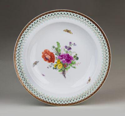 Ornamental plate - Decorated with pierced rim, a flower bouquet and butterflies