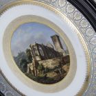 The rim of the plate is decorated with gilt rows of palmets, pearls and wave crests. The surface shows a landscape in a gilt meander frame. The painting faithfully depicts the romantic and picturesque ruins of a Gothic church, with tow standing and two sitting figures in the foreground, a priest talking to two peasant women, two oxen. In the far-away background there is a mountain peak with castle, surmounted by floating clouds in the sky. The rim bears and inscription in the bottom middle: Ruines du Monastere de Tuttenhausen (Bas-Rihn).
