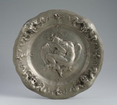 The plate is round, with a wavy rim. The surface shows a naked, relief female figure with an eagle, the rim is decorated with the alternating figures of two masks, a skull and mermaids. The Budapest Museum of Applied Arts purchased two pieces from Desbois at the 1900 Paris International Exhibition. One of them, with Inv.No. 56 is similar to the plate described above both in size, shape and composition. This plate depicts a figure of classical mythology. The sitting figure bends forward, hiding her face with one of her arms and hugging the animal. The central ornament is enframed by the vivid, relief decoration of the rim.