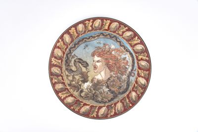 Techniques: | black contoured; contoured with gold; painted in polychrome overglaze; thrown in mould (presumably) |