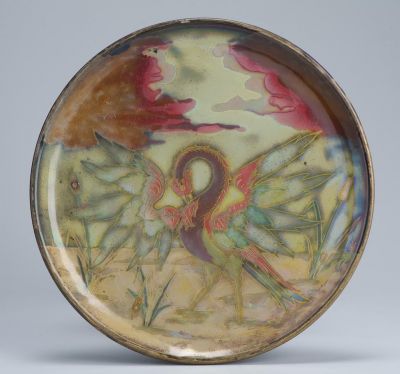 The round, flat plate had a plain, up curving rim. The surface is decorated with a picturesque, symbolic pattern of a pelican bird with spread wings, tearing up its breast standing in the reed. There are moving cloud patches in the sky. The iridescent surface is richly shaded, dominated by blunt green and purple colours. The silver oxide contours glitter in golden yellow.