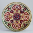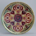 The round plate is homogeneously concave, with a plain rim. There is a foot ring on the reverse. The front decoration is out-lined by deep contours, against which the glazed motifs slightly protrude. The middle has a rosette enclosed by eight hearts, in red and blue. Around the centre, there are four richly ornamented, stylized tulip stems springing from four hearts, painted in red and golden-green against the natural colour of the four semicircular fields. The tulip motifs are separated by hearts. Above the semicircles, red and golden green tulip heads appear with a row of leaves, against a black base. The line ornamentation of the rim is golden green. The dark, solemn colours, the iridescent and metallic glazes as well as the symmetrical, four-lobed arrangement give the plate an archaic appearance. Its designer tried to create a representative, Art Nouveau version of the "national decoration" of revival styles. In Façon book 12 of the Zsolnay factory there is a series of nine plates, signed by Henrik Darilek, a designer of the factory. The remark beside them was «Darilek mintái». This plate can be identified with No. 7350 design of the series.