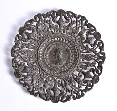 The round plate has a pierced rim of leaved tendrils alternating with lozenge and pretzel motifs. The centre shows the portrait of the young Francis Joseph, in profile, place in a circle enclosed by repousse leaves. This circle is enframed with pierced arcades. An analogous piece can be found in the Hungarian National Museum.