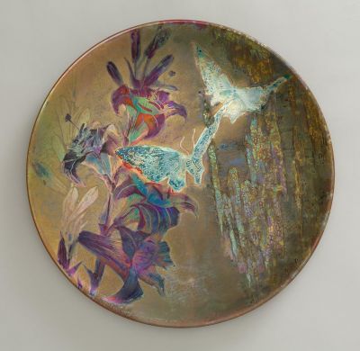 A flat dish, with a slightly splaying rim. The surface is decorated with flying butterflies above dark purple lilies, against the etched, matte, greyish-green background of elaborately painted scrolls.