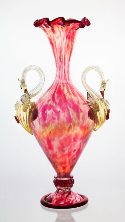 The broad foot conically rises at the centre it has a splaying rim and supports a part of four wings that holds the bulging and then again narrowing body with a broad, horn-shaped neck and a wavy, splaying top rim. The two sides of the body are decorated with handles, formed of swans with their head bent down. The whole surface of the vase is pink, striped by melted glass threads and spotted. The body of the swans are made of white opaque glass, their beaks and feet are of red glass. The form and the decoration of the vase are based on traditions of Venice-Murano glass art.