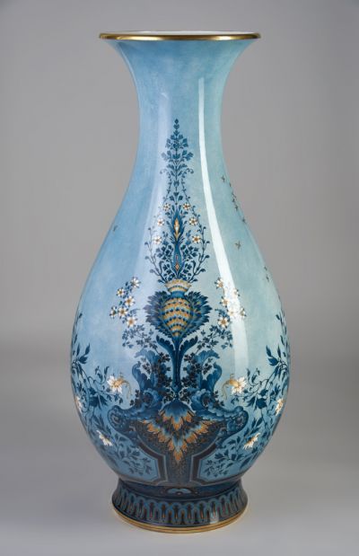The foot ring is plain, conical. The extremely large pear-shaped body is outstanding both in moulding and firing it has a finely curved neck and a splaying to rim. It was placed right on the ground or on a short plinth to decorate representative interiours. A separate metal case was put through the broad top to hold the flowers. The whole surface is decorated with hand-painting. The motifs are lofty and elegant the abstract Baroque-like ornaments are combined with finely detailed, slightly stylised natural motifs in an original and tasteful way. The foot is decorated with a frieze. Four symmetrical ornaments spring up from the border stripes -lisenes - of the bottom simple motifs of acanthus leaves, pomegranates and blossoming tendrils alternate with more complicated ones. At the top of the vase there are scattered bees, painted in gold, slightly relief. The background is greyish-blue, the painting under glaze consists of two shades of blue without the painting, the body itself is white. The pomegranates, flowers and leaves are contoured with shaded yellow enamel overglaze.