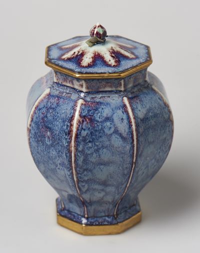 The egg-shaped body and the short neck of eight sections are supported by an octagonal foot. The middle of the octagonal lid is slightly domed, with a dropshaped finial. The marbled, coulé glaze is melted of bluish, grey, purple and red. The horizontal edges are white, the lid is enriched with an eight-pointed star. The edges of the foot, top and lid rim are lined with gold.