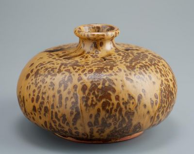 The bun-shaped body stands on a broad, flat foot rim and ends in a short, slim neck, with a splaying, edged top rim. The vase is covered with thick matte, coulee glaze the irregular surface is stained with dark, nut, and rust-brown. The shoulders and the veins of the flows are enriched with bright, brown stains.