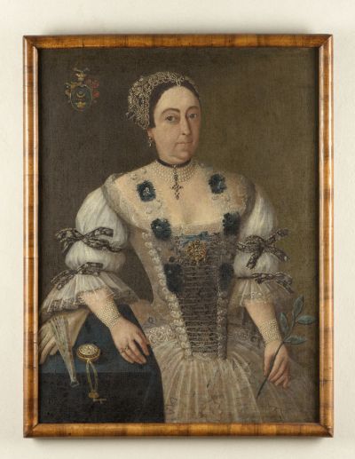 The subject is a middle-aged woman in an ochre- coloured dress embroidered with white flowers. The waist fastens with buckles and ribbons. The waist, the apron and the corset-bodice tied with two pairs of ribbons on the sleeves, are trimmed with lace. On the sleeves and the neck are strings of pearls on the neck-band is a cross-pendant. On the breast is a pendant. The head-dress is richly embroidered with pearls. Her right hand lies on a table covered with blue drapery in her left hand is a leafy branch. On the table is a painted fan, white gloves and a watch. The background is table greenish-brown, with the family coat-of-arms of the Radvanszky's above, on the left. The picture painted for the family gallery is characterized by warm colours and chiaroscuro. The slightly fragmented portrayal is a traditional solution of 17th century, portrait-technique. The talented local painter with a conservative approach might have been the member of a guild of one of the towns of Szepesseg. David Spielenberger was active in the Szepesseg as a Lutheran pastor. The father of Fruzsina Radvanszky, Janos Radvanszky was an important literary figure of the nobility at the end of the 17th century, who had joined Ferenc Rakoczi II as Deputy-Lieutenant of the county Zolyom at first he acted as his treasurer, and later as court counsellor.