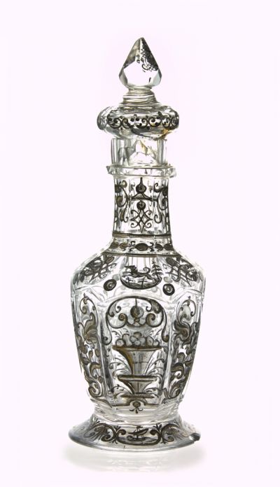 The body, an upturned pear shape, stands on a foot forming a truncated cone. It has curved, faceted sides, and a pared, knobbed neck. Cut foliage decorates the whole surface, with traces of gilding. The front shows two galleys with a lighthouse, while the back depicts a dog chasing a deer. The other sides have vases with flowers. The cylindrical stopper swells at the top its tipped finial is olivine faceted. A flask of analogous shape, from around 1730, with the crowned calligraphic initials of the Waldstein-family, has been published, without catalogue number, in Cat. 1970a. The piece described above is different from its Bohemian companion only in the form of its foot.