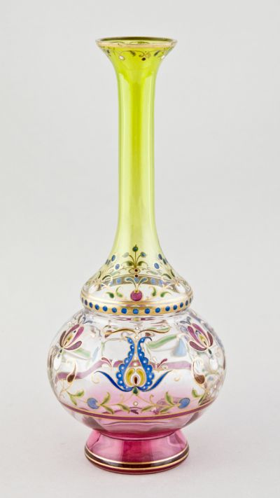 The ball-shaped bowl stands on a small, high foot, ending in a pipe-like neck that bulges at the bottom and ends in a splaying rim. The pink glass foot is decorated with red, transparent enamel painting running all round and lined with a gilt stripe. The colourless, transparent glass body is painted in polychrome, transparent enamel with historicizing, Hungarian ornaments of stylized pomegranate and pink motifs, enframed by gold. The neck is uranic green glass, lined with stylised plant motifs along the top rim.