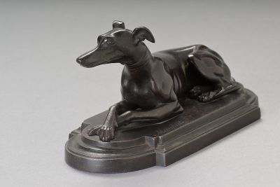 The two shorter sides of the prismatic plinth of a jointed rim close in a semicircle. The figure of the decoration is a lying hound, crossing its front legs and raising its head, with a belt on its neck.
