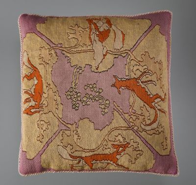 The cushion shows an illustration for the ancient Greek fable of Aesop «The fox and the grapes». Each side of the cushion shows the fox walking, noticing the cluster of grapes, reaching forward for it, then, failing to reach it and walking sadly away. The background is light purple and light yellow, the twigs, and the cluster of grapes in the centre are only contoured. The composition uses the contrast of the reserved background and the picturesque, rust-brown figure of the fox. The cushion was introduced at the 1902 Christmas exhibition. According to the catalogue, it was embroidered by Paula Kőrössy. However, according to the previous owner, the cushion was embroidered by her mother, Lenke Boér.